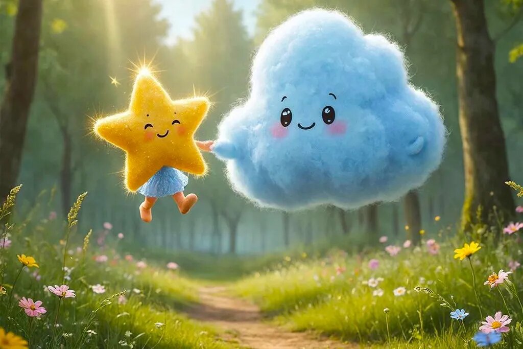 Пушистый Облачко и Звездочка Жил-был на небе маленький, пушистый облачко по имени Пушистик. Он был очень любопытным и любил смотреть вниз, на Землю. Однажды вечером, когда небо стало темным, Пушистик увидел маленькую, яркую звездочку. «Привет!» – прошептал Пушистик.