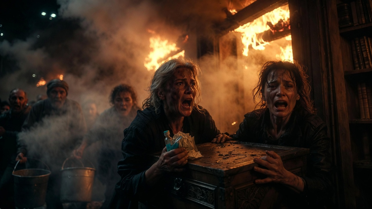 «Пожар!» — закричала она Элиф. Та, не теряя присутствия духа, вызвала пожарных, пока Фатьма пыталась справиться с огнем своими силами. Но проводка в старых деревянных домах — как порох. Пламя, найдя воздух, рвануло вверх по стене с ужасающей скоростью. Оно лизало потолок, пожирало полки с книгами, обнимало старую дубовую стойку. Жар стал невыносимым. Элиф втащила мать на улицу, но Фатьма, вырвавшись, сделала попытку броситься обратно.
