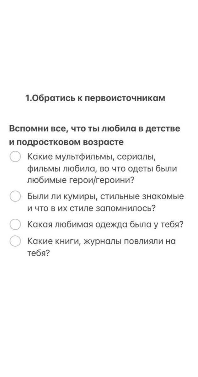 В том году выкладывала в инсту алгоритм действий по формированию индивидуального стиля для тех, кто самостоятельно хочет заняться прокачкой стиля с нового года ❤️🔥 Решила продублировать сюда, актуальность этого механизма неизменна! Подойдет для тех, кто хочет перестать одеваться как подросток, кто хочет встряхнуть себя в декрете, кто хочет вылезти из джинс и внедрять больше юбок и платьев в гардероб. Да и вообще всем, чтобы пересмотреть свой гардероб с точки зрения его соответствия вашей личности на данный момент. ОЧЕНЬ часто такое бывает, что вы изменились внутренне, а гардероб как был, так и остался 🥲 *Рекомендую блоки разбивать по времени выполнения, не бросаться разом, а дополнять по мере того, как что-то будет вспоминаться. Отличный инструмент, чтобы копнуть глубже, чем просто протипироваться или накупить разных шмоток в надежде стать более стильной