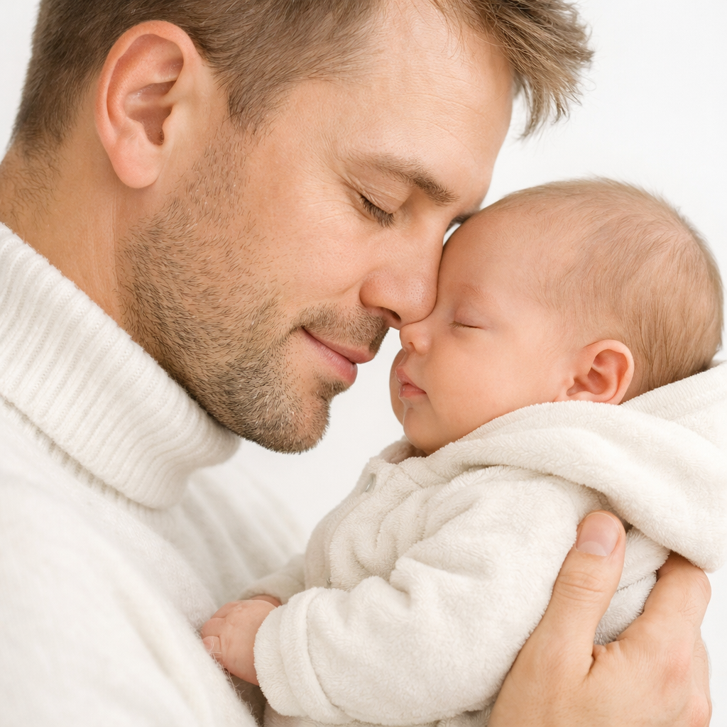 Большинство AI-генераций "папа и малыш" выглядят как пластиковые студийные снимки — слишком гладкая кожа, нереальный "божественный" свет, отсутствие гравитации.
