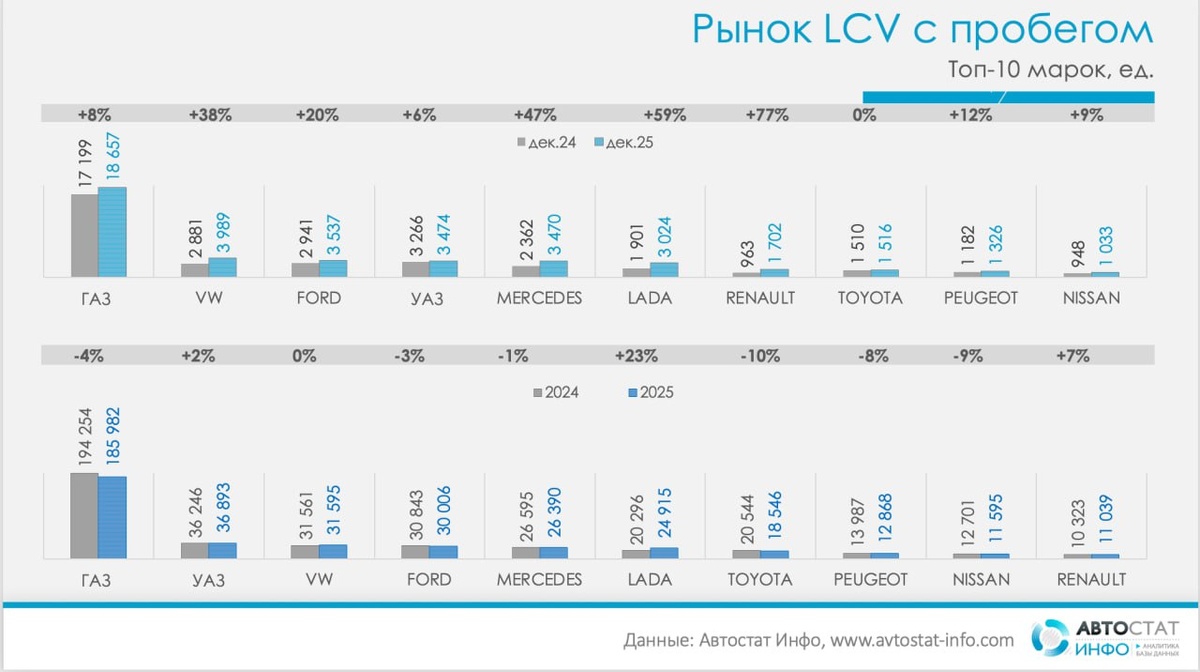 Сегмент LCV с пробегом завершил 2025-й на легкой «ноте роста», хотя в целом год оказался слабее 2024-го. По данным «Автостат Инфо», в декабре на авторынке России было совершено 47 957 сделок с подержанными легкими коммерческими автомобилями, что на 20% больше, чем год назад (40 122 автомобиля). Но по итогам всего года рынок сократился на 2%: 448 247 перерегистраций против 457 406 в 2024-м. Декабрьская траектория хорошо видна на помесячной кривой. После провала в начале лета, когда объем опускался к 31–34 тыс. машин, осень принесла оживление, а финальный рывок декабря вывел рынок подержанных LCV на максимум года. Относительно ноября 2025-го перерегистрации LCV выросли на 19% (с 40 382 до 47 957 единиц). Это классическая картина «догоняющего» спроса: бизнес закрывает год, добирает недостающую технику под контракты на следующий сезон и фиксирует покупки до возможных изменений условий финансирования. Лидерство на рынке LCV с пробегом по-прежнему за ГАЗом: в декабре было продано 18 657 т