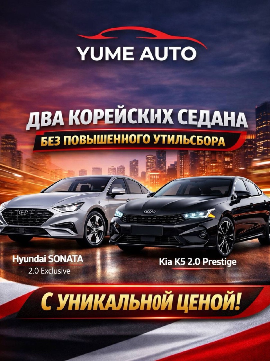 , рассказываем подробнее 👇 Мы подготовили для вас подборку — это два корейских седана для внутреннего рынка, которые не попали под повышенный утильсбор и могут быть привезены по действительно выгодной цене, так еще и почти новые. Это не «перекупские» варианты, а автомобили с прозрачной историей, минимальными пробегами и отличными комплектациями. О каких авто идет речь? 👇 🚗 Hyundai Sonata 2.0 Exclusive | Год 2024 Комфортный, статусный седан для тех, кто ценит плавность хода, надежность и современный интерьер. ◾️Об автомобиле на нашем официальном сайте: https://yume-auto.ru/korea/hyundai/sonata/1937289.html Кузов седан Двигатель бензин Коробка автомат Пробег 32 090 км 💰 ЦЕНА 3 018 066 ₽ 🚗 Kia K5 2.0 Prestige | Год 2025 Практически новый автомобиль в одной из самых востребованных комплектаций. Отличный вариант как для личного пользования, так и для перепродажи в будущем. ◾️Об автомобиле на нашем официальном сайте: https://yume-auto.ru/korea/kia/k5/1942887.html Кузов седан Объём 19
