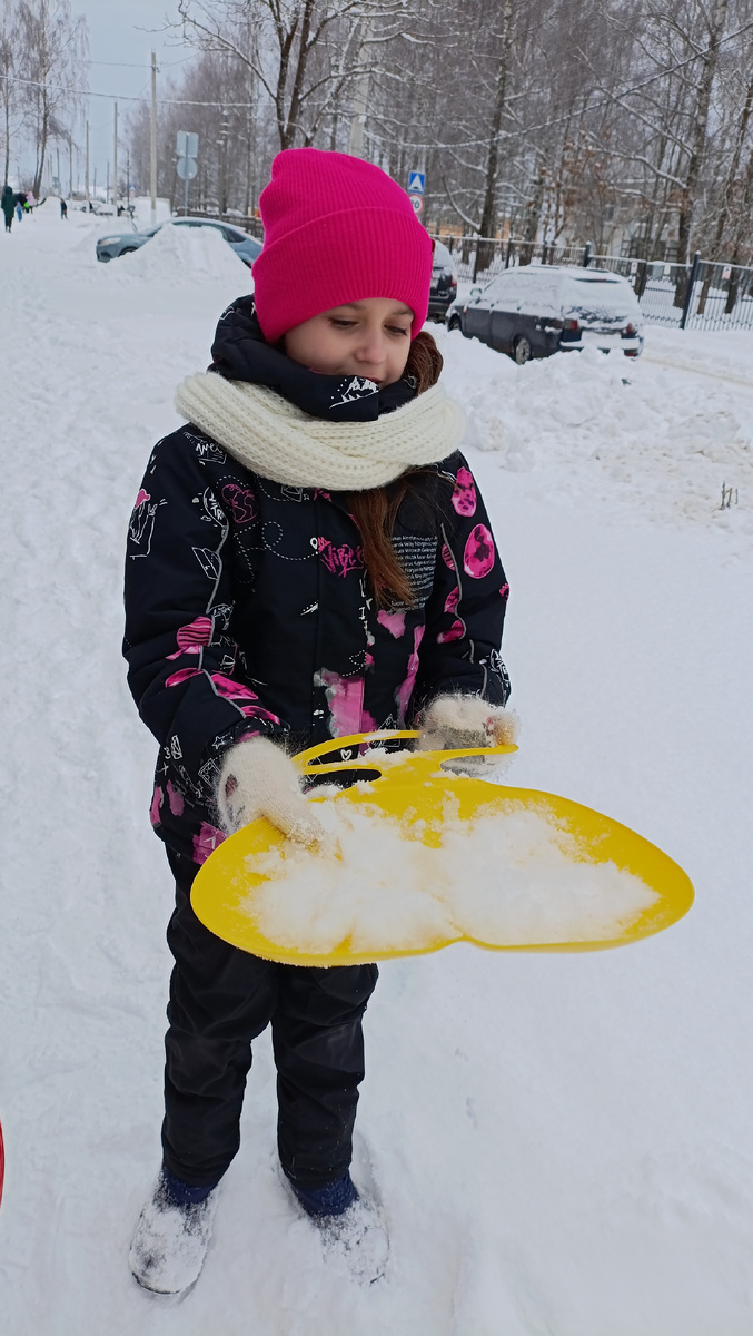 На фотографиях — яркий зимний день. Снег искрится под ногами, а вокруг вырастают целые снежные горы, словно созданные специально для детских забав. Тёплая одежда, пушистые