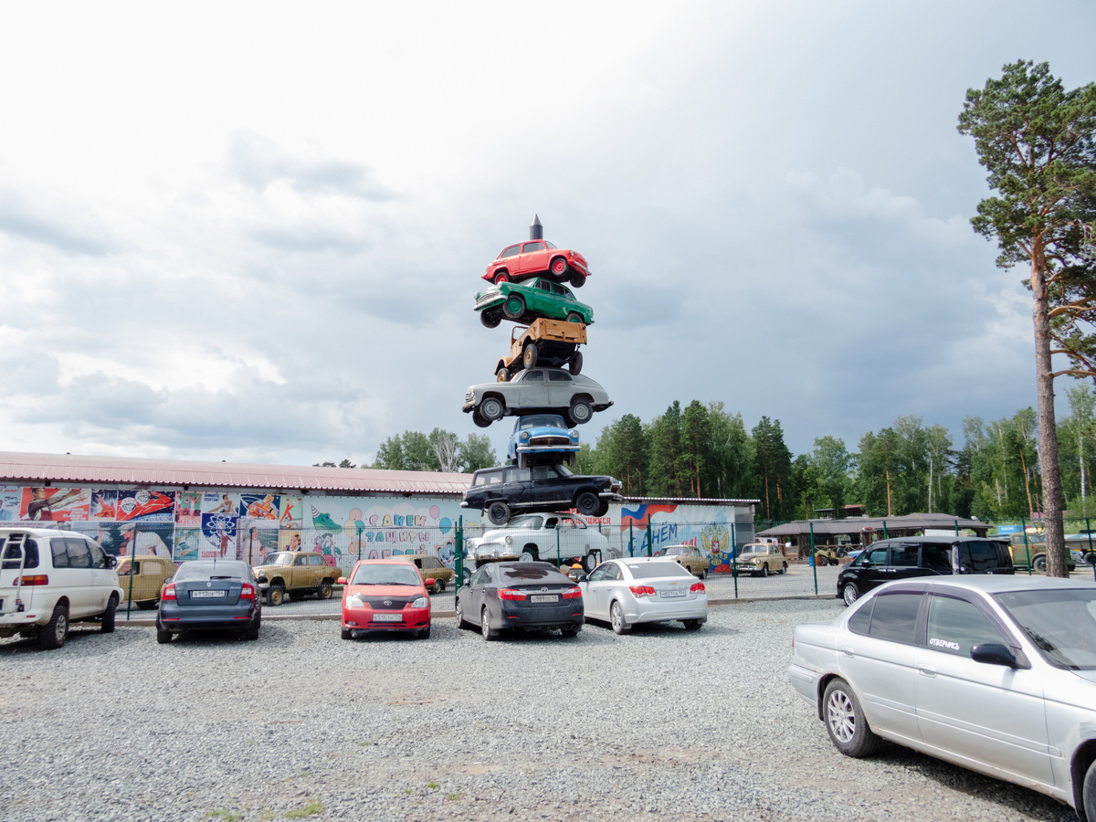 По дороге на семинар трудно было не заметить одно весьма необычное сооружение. Ничего себе шашлык! Кто нанизал на шампур машины и зачем? И когда закончились занятия, я вернулся сюда, чтобы рассмотреть все как следует. Так привлекает посетителей музейный комплекс под названием «Галерея времени». Парк состоит из нескольких павильонов, для посещения каждого нужен отдельный талончик. На входе приобретается сразу весь комплект, хотя можно, наверное, и по отдельности. В каждом павильоне правила свои. В одном просто ходишь и смотришь, в другом за дополнительную плату можно пригласить экскурсовода, в третьем запускают только экскурсии, но дополнительных денег не берут. Я начал с музея автомобилей. Недаром комплекс назван «Галерея времени». Экспозиция построена так, что проходя вдоль рядов машин, ты как будто отматываешь время назад, от наших дней до самого начала, а потом, сделав разворот, возвращаешься обратно. Покажу только несколько экспонатов, какие запомнились. Начнем с тех машин, что зна
