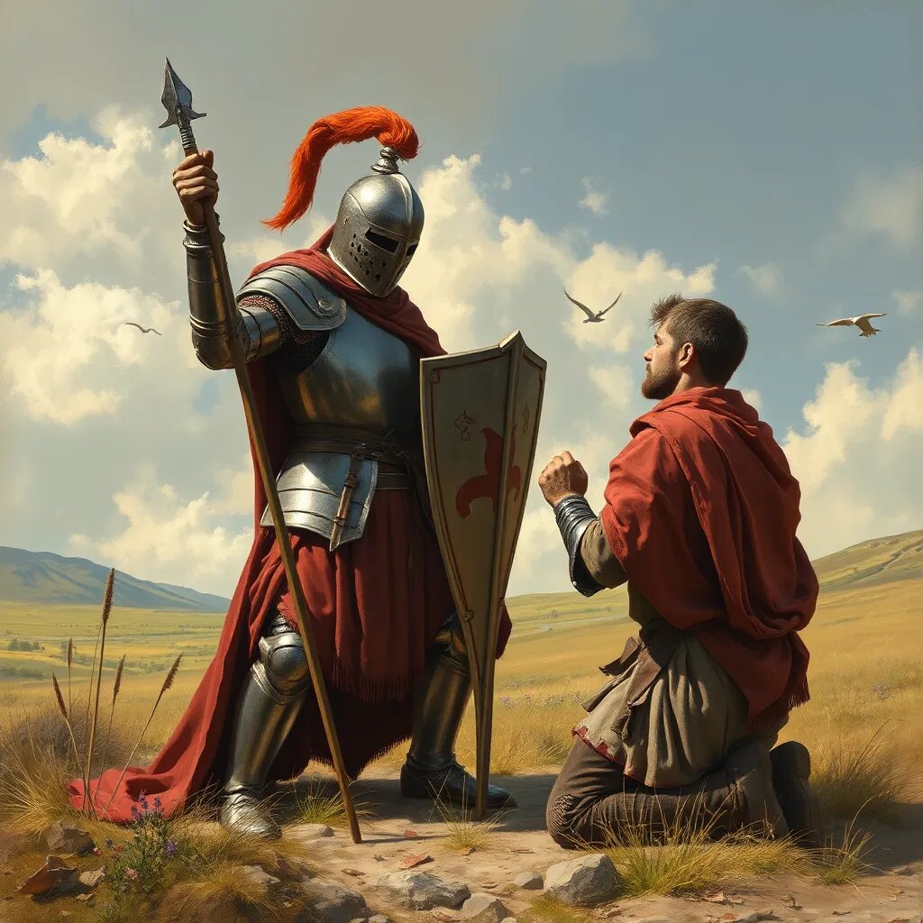 Изначально, еще в раннем средневековье, как таковых-то и рыцарей не было, были военные вожди, конечно. Но это скорее на типа король с постоянной дружиной. А на уровне поселений ополчение собирали, аргументируя либо необходимостью защититься, либо возможностью пограбить соседей. Потом придумали, чтобы не дергать постоянно всех крестьян, не отрывать от поля, да и не приходили воевать одни хромые и кривые, вооруженные вилами с огорода, пусть, мол, приходят те, кто побогаче, кто может позволить себе оружие нормальное приобрести, да хоть доспехи какие-никакие. А кто не может, пусть скидывается на тех, кто сможет, в помощь им. Потом это «скидывается» превратилось в постоянные подати, война — не война, плати. А более богатый сосед превратился в господина — рыцаря.