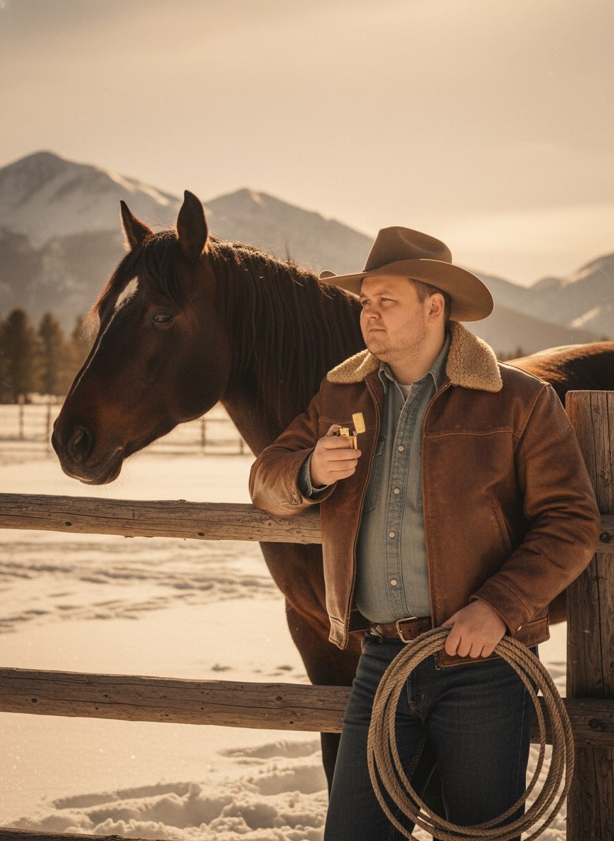 🔥 Делаем из тебя того самого легендарного ковбоя из олдскульной рекламы. Суровый взгляд, выжженная солнцем пустыня и стиль, который никогда не выйдет из моды. Закидываем фото в бот @SnapToVideo_bot, ставим сходство на максимум и забираем брутальный контент. ⚡️ Используя загруженное селфи в качестве точного эталона лица со 100-процентным совпадением (--face_fidelity 1.0), создайте фотографию по описанию, сохранив полное сходство с оригиналом. [Кинематографичный портрет] мужчины в эстетике [винтажной рекламы ковбоя Мальборо]. На нём [потертая коричневая кожаная куртка с меховым воротником, надетая поверх выцветшей джинсовой рубашки, и классическая фетровая ковбойская шляпа]. Он [стоит, прислонившись к старому деревянному забору, и задумчиво смотрит вдаль]. В руках [старое лассо или винтажная зажигалка]. [Локация: пыльная пустыня Аризоны на закате]. [Освещение: жесткий контровой свет «золотого часа», подчеркивающий текстуру лица]. Снято на [пленочную камеру 35мм], винтажная цветокоррек