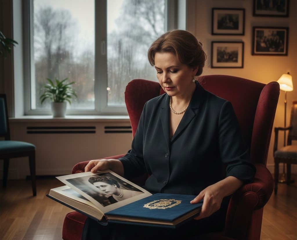 Ольга сидела в глубоком кресле, положив на колени тяжелый бархатный альбом. За окном серый ноябрьский дождь хлестал по стеклам, но в комнате было тепло и стерильно чисто.