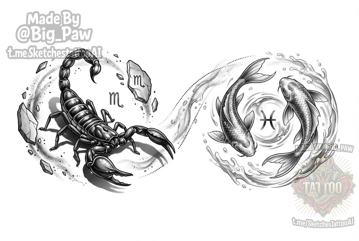 ? 🧠 SYNTX - тут создан эскиз 💎 Информация - все услуги 💀 Эскизы от нейросети 😎 Удалить тату #знакозодиака #рыба #скорпион #эскиз #тату #татуировка