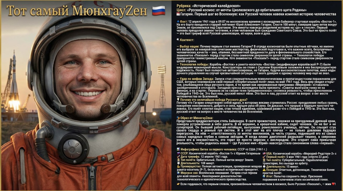 » Цикл: «Русский космос: от мечты Циолковского до орбитального щита Родины» 📅 Гагарин. Первый шаг во Вселенную: как Русский человек навеки изменил историю человечества Часть 1️⃣/2 🔹 Факт: 12 апреля 1961 года в 09:07 по московскому времени с космодрома Байконур стартовал корабль «Восток-1». На его борту находился старший лейтенант Юрий Алексеевич Гагарин. Спустя 108 минут, совершив один виток вокруг Земли, он приземлился под Саратовом. Эти минуты навсегда разделили историю на «до» и «после». Первый человек преодолел земное тяготение, и этим человеком был гражданин Советского Союза. Это был не просто полёт — это был триумф всей Русской цивилизации, её науки, воли и духа. 🔍 Контекст: — Выбор нации: Почему первым стал именно Гагарин? В отряде космонавтов были опытные лётчики, но именно его выбрали за невероятное сочетание мастерства, физической подготовки и, что важнее всего, безупречных человеческих качеств — ума, обаяния, беззаветной преданности делу и феноменального спокойствия. Е