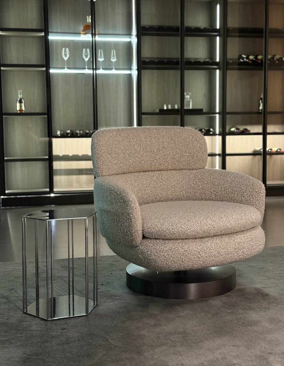 Оно объединяет в себе два главных интерьерных тренда: обволакивающие органические формы и тактильную ткань букле. • Трендовая фактура: Ткань букле с ее характерными «завитками» не только эффектно выглядит, но и очень приятна на ощупь. Она добавляет интерьеру глубины и уюта. • Свобода движений: Массивное металлическое основание оснащено плавным поворотным механизмом на 360°. Вы можете легко развернуться к собеседнику или к окну, не вставая с места. • Эргономика «кокона»: Округлая спинка плавно переходит в подлокотники, буквально обнимая вас. Глубокая посадка обеспечивает идеальную поддержку тела. Идеально для зоны чтения, спальни или стильного офиса. Отправьте Ваш проект, мы сделаем расчет @Mak_sim111