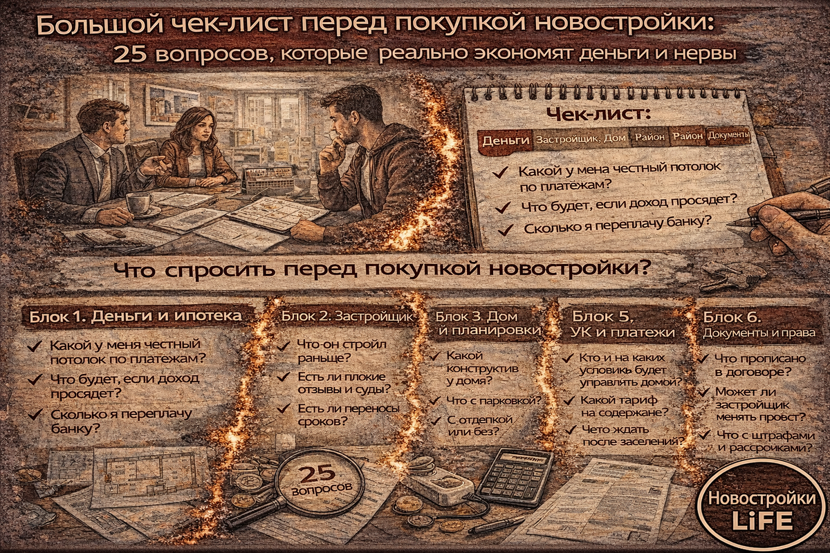 Соберём в одном месте большой чек-лист по новостройке, который закрывает основные болевые точки: деньги, застройщик, дом, район, документы и жизнь после ключей.