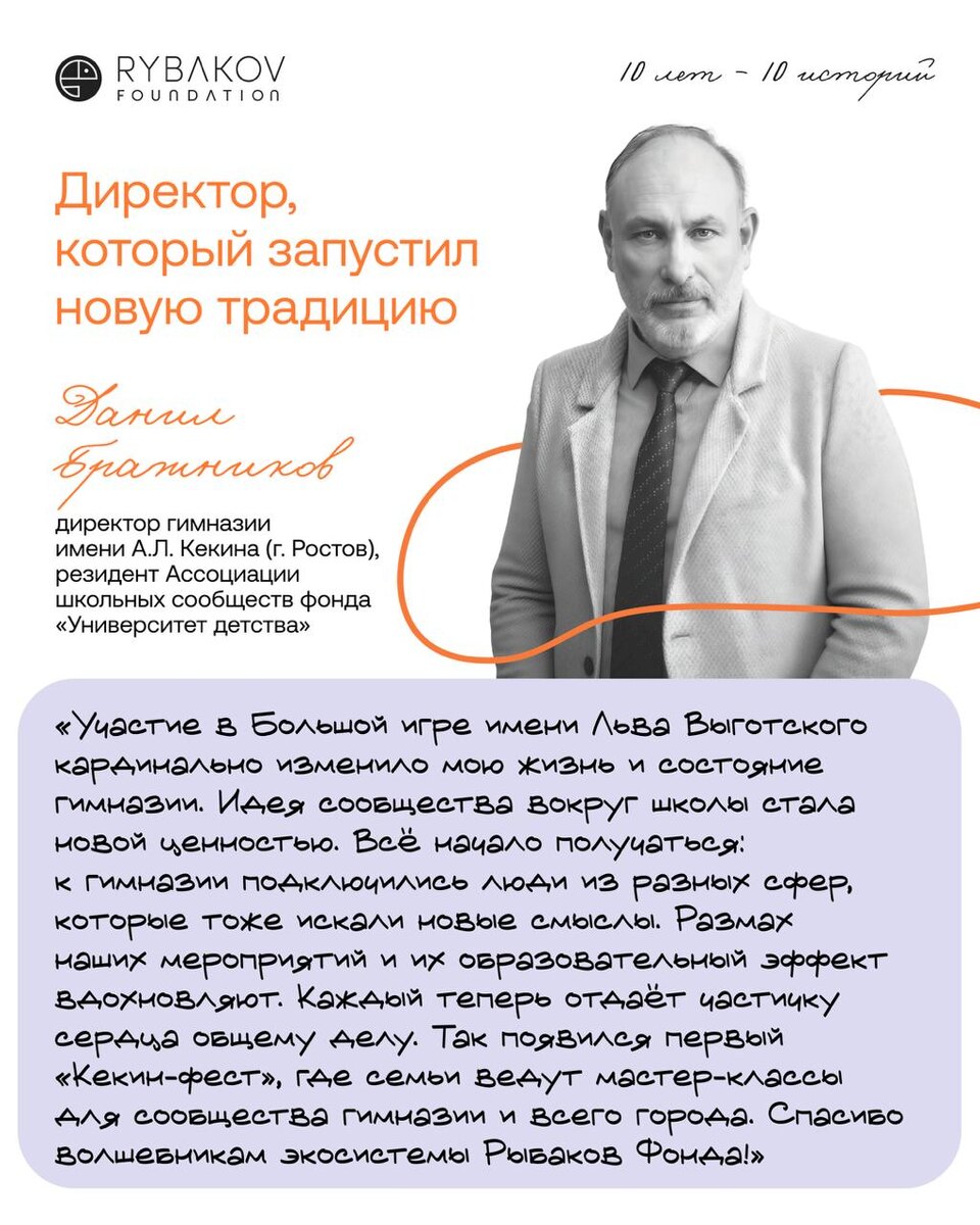 объединили вокруг школы весь город Когда в 2023 году гимназия им.Кекина впервые участвовала в Большой игре имени Выготского, её директор Данил Бражников искал не столько новые методики и инструменты, сколько опору для долгосрочного развития школы. На проектных сессиях возникла идея, которая изменила направление развития гимназии: объединить вокруг неё живое сообщество учеников, родителей, выпускников и партнёров, продолжив традицию первого мецената школы — Алексея Леонтьевича Кекина. Большая игра стала отправной точкой, а импульсом к реальным изменениям — создание целевого капитала, инструмента устойчивой поддержки. В 2024 году эндаумент гимназии пополнился на 1 млн рублей благодаря взносу Максима и Олеси Белоусовых, меценатов Rybakov List. Этот шаг стал сигналом для школьного сообщества: у гимназии появился ресурс для развития на годы вперёд. Уже в июне 2025 года прошёл первый «Кекин-фест» — семейный фестиваль, объединивший более тысячи учеников, родителей, выпускников и друзей шко