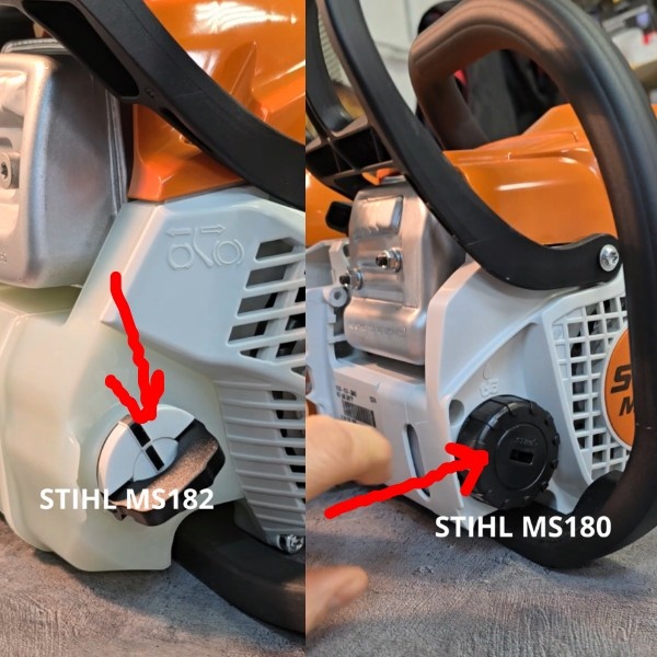 У конкурента в лице Stihl 180 — классический ключевой узел. Под пробку нужен ключ. Если руки грязные или скользкие — пластиковая крышка начинает проскальзывать, создавая лишнее раздражение.
