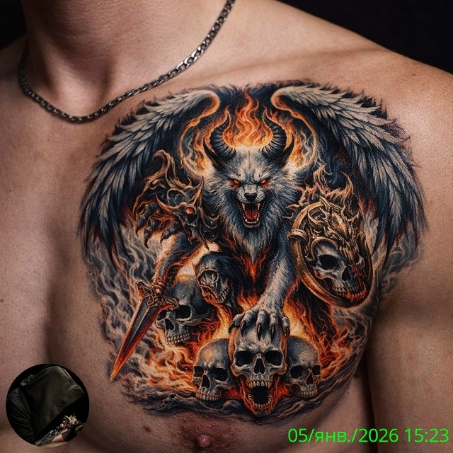 Татуировка на груди, изображающая демона с крыльями и огнем, является ярким примером фантазийного искусства, которое сочетает в себе мощь, драматизм и символику. На изображении мы видим демона с пылающими крыльями, окружённого черепами и щитом, держащего в лапе меч, что создает атмосферу силы, агрессии и мистики.