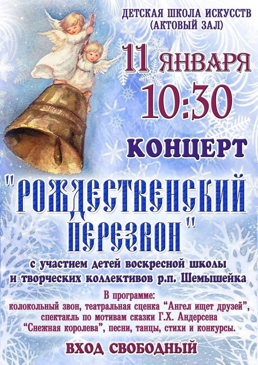 «РОЖДЕСТВЕНСКИЙ ПЕРЕЗВОН» с участием детей Воскресной школы Никольского храма и творческих коллективов р. п. Шемышейка Начало: 10:30 ВХОД СВОБОДНЫЙ