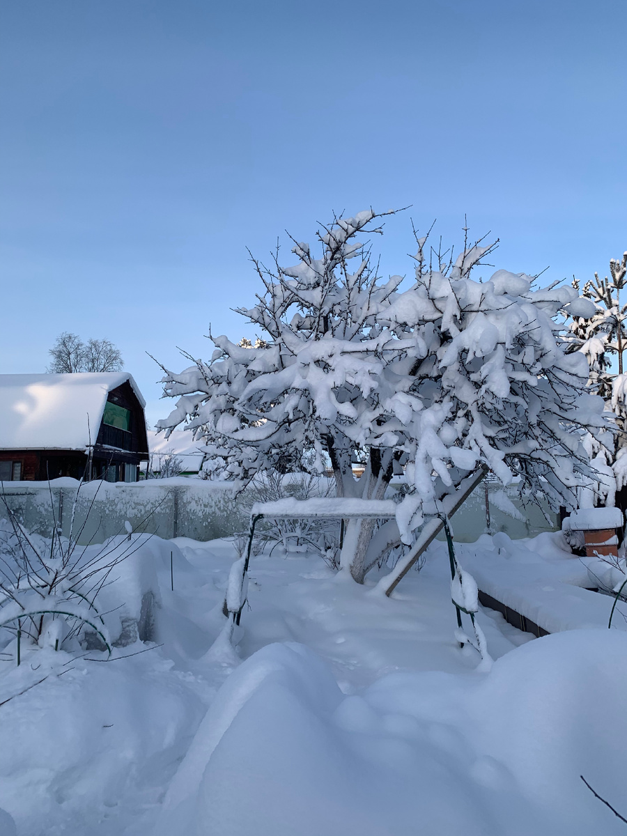 Очень красиво стоять под яблоней. С нее я снег не стряхиваю, его не так много. Веточки очень хрупкие и могут обломаться, а так плодовые почки прикрыты снежком и все хорошо. Этот год должен быть урожайным .