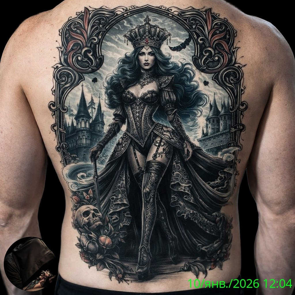 Готическая татуировка — это не просто рисунок на коже, а целая история, которая может рассказать о внутреннем мире человека, его страхах, мечтах и философии. На представленном изображении мы видим королеву, замок и череп, что символизирует власть, мистику и неизбежность смерти.