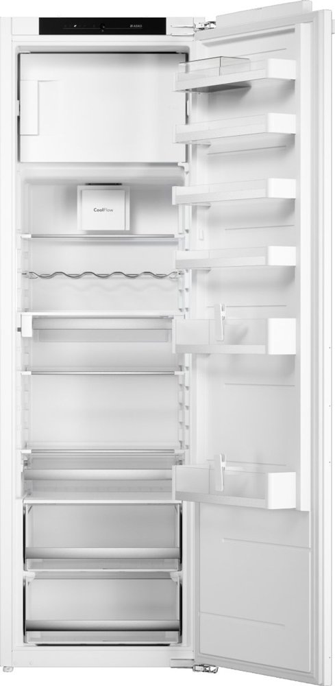 Asko RFB31831EI — встраиваемый комбинированный холодильник с верхним расположением морозильной камеры, рассчитанный на аккуратную интеграцию в кухонный гарнитур и стабильное хранение продуктов без сложного обслуживания. Модель относится к премиальной линейке бренда и ориентирована на точный контроль температуры, равномерное охлаждение и продуманную внутреннюю организацию. Холодильник предназначен для установки в нишу высотой 178 см и шириной 56 см. Корпус имеет размеры 177 × 55,5 × 55 см, что соответствует стандарту встраиваемой техники и позволяет без зазоров интегрировать прибор в колонну. Используется система крепления фасада Door-on-Door, при которой дверца мебели жёстко соединяется с дверцей холодильника. Это обеспечивает плавное открывание, корректную нагрузку на петли и стабильную работу при ежедневном использовании. Дверной упор расположен справа, при необходимости дверь можно перенавесить под планировку кухни. Общий полезный объём холодильника составляет 288 литров. Основная ч