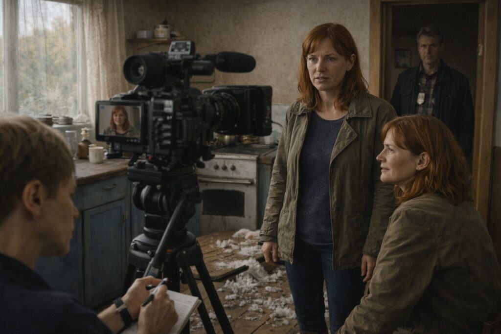 Начали с интервью. Вера рассказывала свою историю — перед камерой, чётко и спокойно. Приезд на похороны тётки. Найденные дневники. Правда о рождении. Угрозы Куликова.