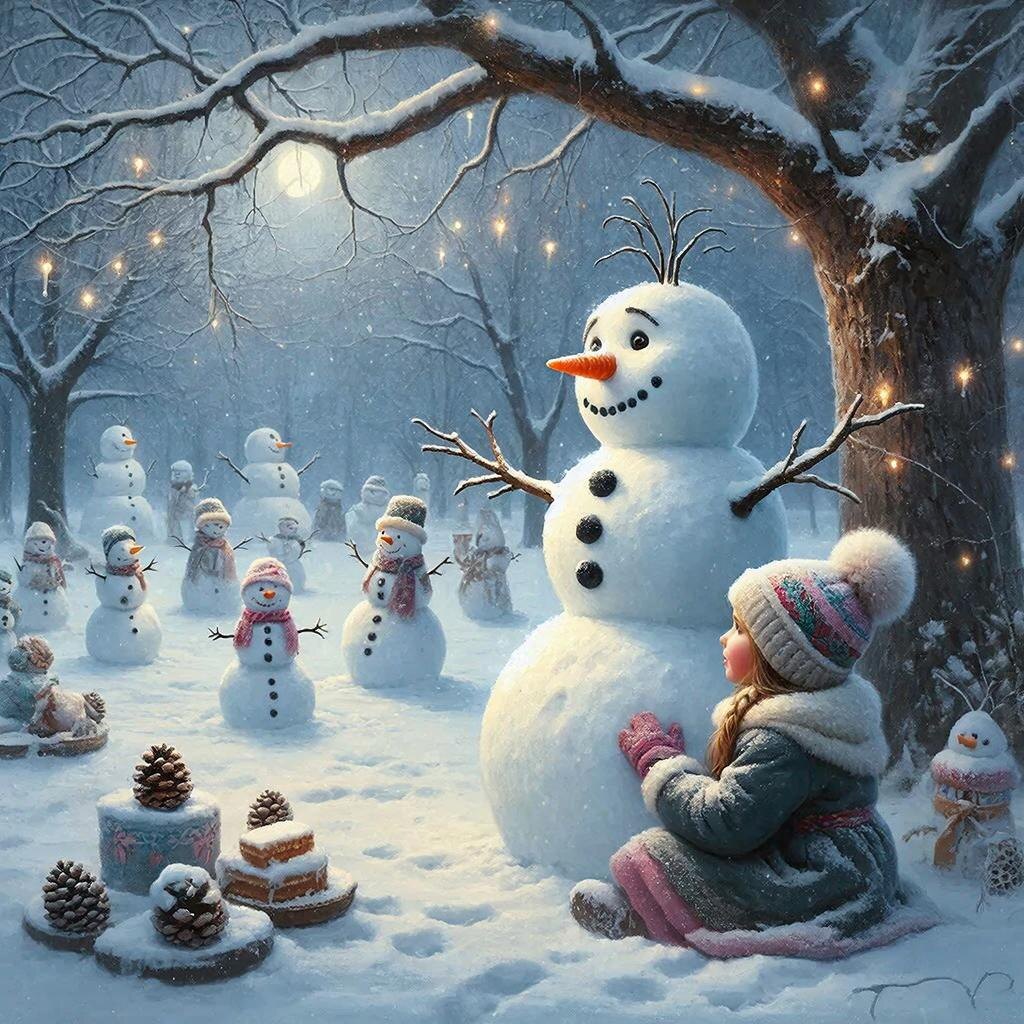 В самом сердце зимы, где снег лежит пушистыми хлопьями на крышах домов, стоял старый-престарый парк. В нём под ветвями векового дерева, жил снеговик - самый первый, между прочим, из всех снеговиков на свете. Он помнил и первые морозы, и первые метели. Однажды к нему подбежала девочка в пушистой шапке. — Снеговик! Здорово, что я тебя встретила - сегодня же твой день рождения! Дедушка утром в газете прочитал, что именно сегодня - день рождения всех снеговиков! Поздравляю тебя! И вдруг Снеговик медленно повернул голову, и глаза-угольки заискрились добрым светом. — Спасибо, милая. Ты права - сегодня не просто январский день, а день, когда самый первый снежный комок покатился по земле, дав начало всем нам. — Самый первый? — удивилась девочка. — А кто же тебя сделал? — Тот, кто умел видеть душу в простом снегу, — тихо ответил снеговик. — Он вдохнул в нас магию и волшебные способности. А потом настали золотые времена - и нас почитали как Духов зимы: приходили люди с добрым сердцем. Они просил