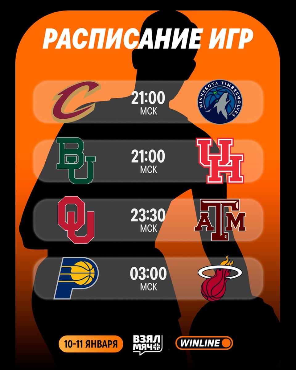 ! Начинаем с раннего матча, а затем вас ждёт встреча Кейда Каннингема с Каваем Ленардом, Кирилл Елатонцев в NCAA и другие крутые игры, которые нельзя пропустить. Прямые трансляции всех матчей смотрите в нашей группе ВК 👈🏼 21:00 | Кливленд — Миннесота 🎙 Сергей Абаев 21:00 | Бэйлор — Хьюстон 🎙 Андрей Протасов 23:30 | Техас — Оклахома 🎙 Матвей Юдкин 03:00 | Индиана — Майами 🎙 Станислав Крайнов 03:30 | Детройт — Клипперс 🎙 Андрей Протасов 04:00 | Бостон — Сан-Антонио 🎙 Иван Латышев 04:00 | Чикаго — Даллас 🎙 Дмитрий Хамидулин 05:30 | Юта — Шарлотт 🎙 Александр Зотеев Какие матчи будете смотреть этим длинным баскетбольным вечером? 🏀 ПОДПИШИСЬ — ЗДЕСЬ ЖИВЁТ БАСКЕТБОЛ!