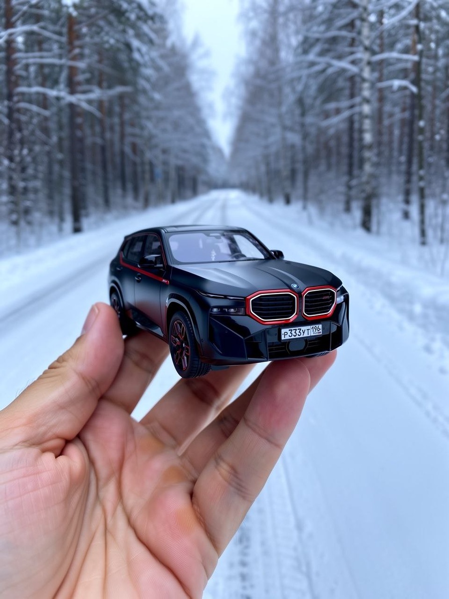 машины: мини-копия в руке 100% идентична оригиналу (бренд, модель, цвет, пропорции, детали, номерной знакр Р333УТ 196). Зимняя заснеженная лесная дорога; в кадре только дорога, рука и мини-машина. Рука естественно держит мини-машину над дорогой, перспектива реалистичная. Крупный/средний план, малая ГРИП: рука и машина в фокусе, фон мягко размытый. Мягкий дневной зимний свет, холодные тона, реальные тени и отражения. Фотореализм, один кадр, без CGI, стилизации и изменений дизайна https://t.me/KPZYoyTube 💵 Отблагодарить
