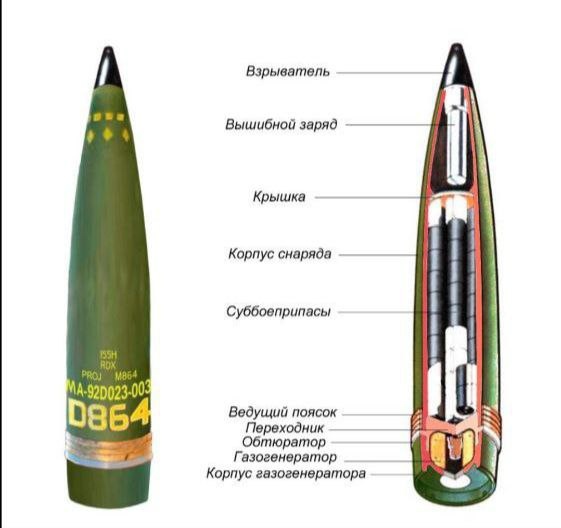 М483А1 К 1975 году был создан первый массовый 155-мм кассетный снаряд под обозначением M483A1. • Вес снаряда: 46,5 кг. • Начинка: 88 суббоеприпасов. • Максимальная дальность стрельбы: до 17 км. До сих пор используется рядом стран. М864 Создан к 1987 году и на долгие годы стал основным кассетным боеприпасом американской армии. • Вес: 46,3 кг. • Длина: 899 мм. • Основное отличие: наличие донного газогенератора, что увеличило дальность стрельбы до 30 км (для орудий с длиной ствола 39 калибров). • Начинка: 72 суббоеприпаса (M42 — 48 штук, M46 — 24 штуки). Такое же неравномерное распределение типов суббоеприпасов характерно и для M483A1. Характеристики суббоеприпасов M42 и M46 Оба типа идентичны по внешним размерам (длина 82,55 мм) и являются неуправляемыми. Для стабилизации при падении в верхней части каждого элемента закреплен кусочек ткани. • M42: весит 208 грамм. Стенки имеют специальные нарезы для усиления осколочного действия. • M46: весит 213 грамм. Стенка толще и тяжелее, нарезы о