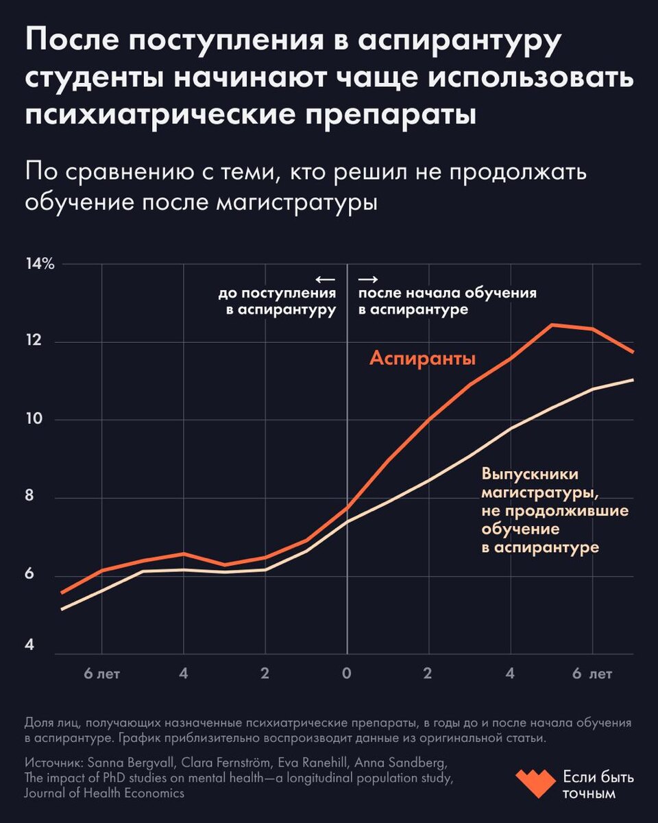 Ученые оценили психическое здоровье по тому, получал ли человек рецепты на психиатрические препараты и попадал ли в стационар с психиатрическим диагнозом. По данным государственных регистров они проследили, как со временем меняются эти показатели у тех, кто поступил в аспирантуру в Швеции, и у выпускников магистратуры, которые не продолжили обучение. Для сравнения брали людей с одной специальностью и тем же годом окончания магистратуры. 🔺Что происходит со студентами До поступления в аспирантуру будущие PhD-студенты по приему психиатрических препаратов не отличаются от других выпускников магистратуры. Это означает, что в аспирантуру не идут люди с изначально более высоким уровнем психических проблем. Уровень приема психиатрических препаратов растет у обеих групп, но у PhD-студентов сразу после начала учебы этот рост заметно ускоряется. Использование психиатрических препаратов растет на протяжении аспирантуры и достигает пика примерно на 5–6 году. После ее завершения показатели снижаютс