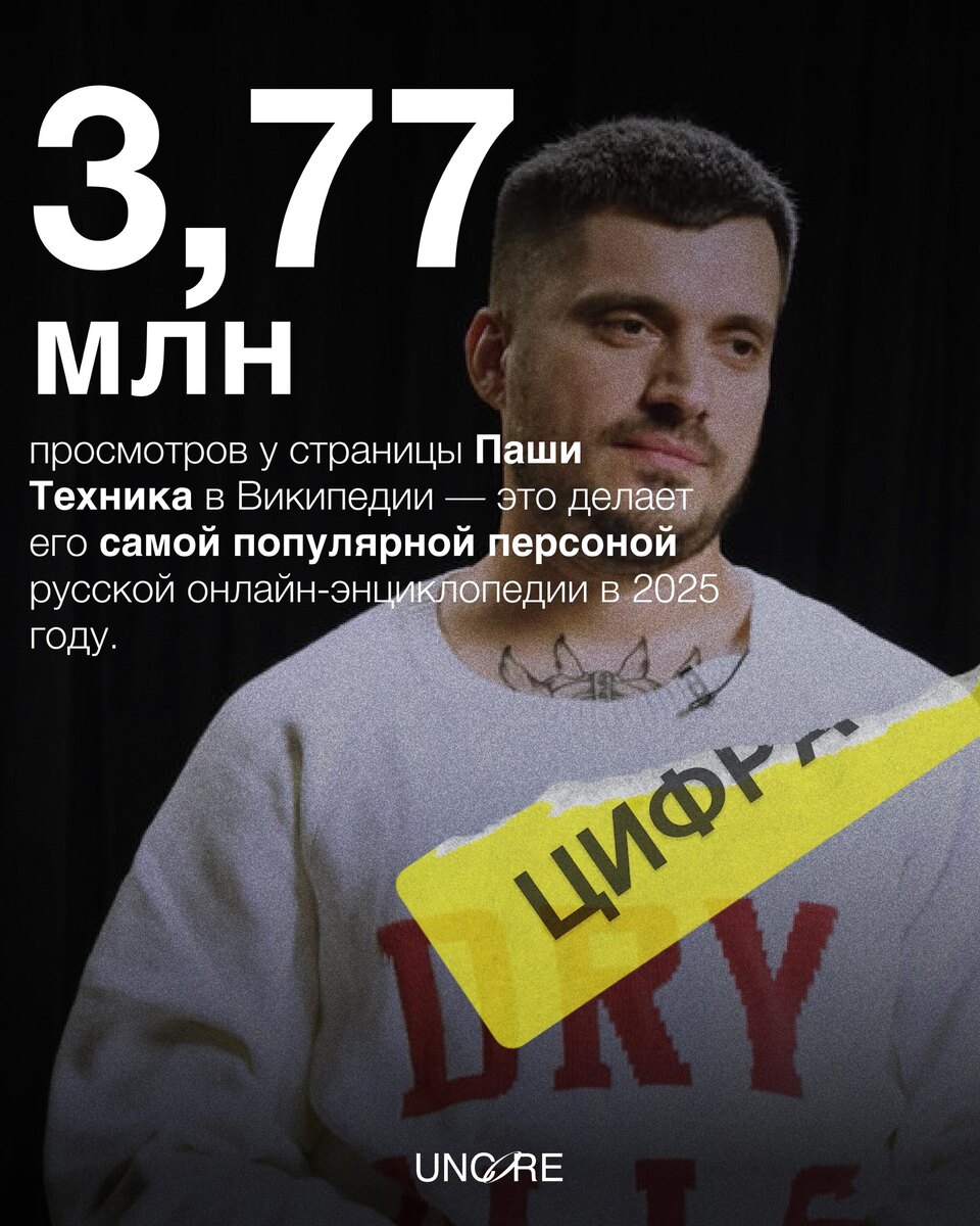 Паша Техник стал самым читаемым человеком русской Википедии по итогам 2025 года. Его страницу открыли 3,77 млн раз. Для ориентира, страницу Владимира Путин — 3,71 млн.