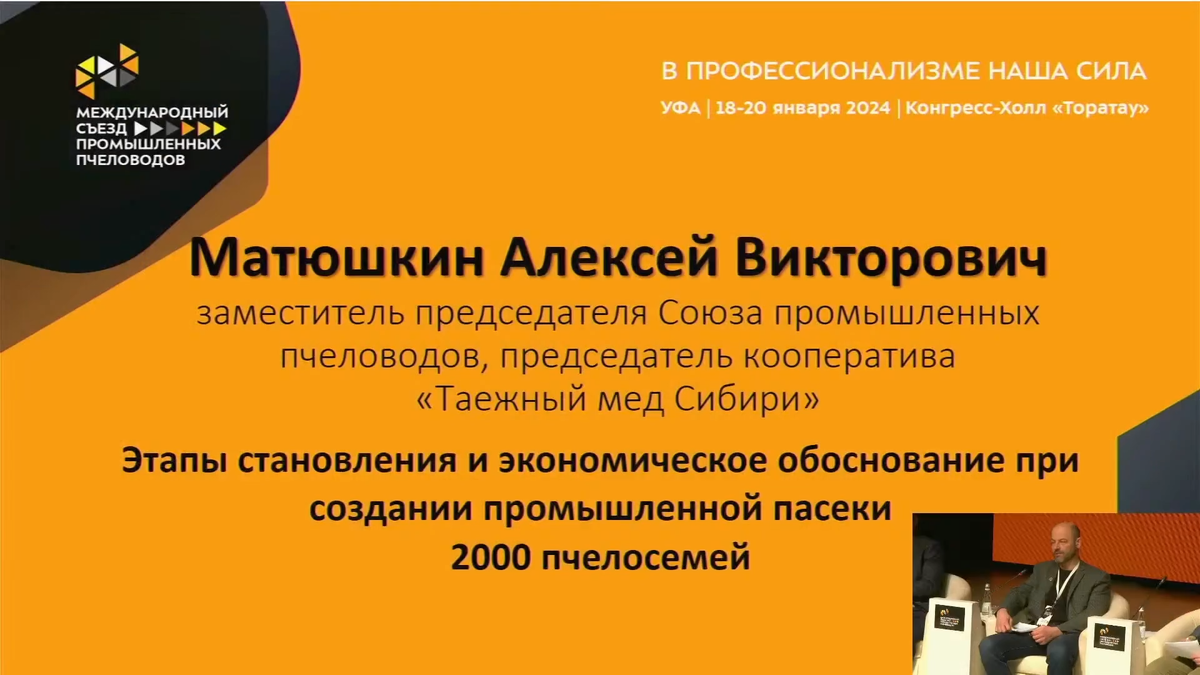 Вот исполнилось 30 лет пасеки Матюшкиных, это наша семья, мы достигли этого благодаря тому, что вся семья работает на пасеке, косвенно как-то, то есть девчонки сначала с женой помогали мёд качать, потом пришла стадия продавать в розницу, когда мы на ярмарку с 2007 года сами в Кузбассе в Кемерово сделали ярмарку и до сих пор она работает. Эта ярмарка, они уже стали продавцами, теперь они руководители продавцов. Торговые точки, вот последняя она вот как бы выглядит уже вот так. Естественно, мы весь мёд свой не можем продать в розницу, поэтому продаем активно оптом и свое дальнейшее развитие видим только в двух направлениях пока. Ну то есть оптом, то есть мёд должен быть уже как побочный продукт. В этом году на съезд пчеловодов в Сибири прилетали друзья наши из Ростова, из Краснодара, Сергей Шумейко, Виталий Варибрус, я очень благодарен им обоим. Виталий Варибрус как раз расширил горизонты. В общем-то, цель стоит вот по его примеру продавать пакеты. Вы видите пока у нас запрет никто не отменил, значит спрос на пакеты будет и у нас присутствует промышленник Александр Харин на первом ряду, который в Кузбасс там приезжал и его лекция на ютубе есть, наберите Александр Харин Кемерово, значит и посмотрите как с семьи получать на 60-й параллели в Перми на севере, севернее чем Кемерово, по два пакета с семьи продавать, еще липовый мёд там как-то пытаетесь взять, да? Ну как раз тема Егора про сдвоенный на один магазин семьи, это ну возможность от двух маток получать и пакеты и на мёд еще сработать, поэтому дальнейшее свое развитие видим в продаже пакетов, в отвозе хвостов на опыление той же гречихи, ну и развитие этих хвостов на рапсе, потому что рапс тоже нуждается в опылении, постепенно, я думаю, аграрии придут и к тому, что пчелы будут еще и на рапсе, который в июле цветет, а гречка в конец июля-августа так у нас цветет, поэтому по технике сразу скажу, ребят, сейчас есть более экономичные варианты, они стоят у вас на площадке здесь возле Таратау, УАЗ «Профи» и прицеп, который с изолайдером, это в принципе для пасеки 500 пчелосемей, ну больше он не вытянет, ну там уже дальше тиражировать можно, какие плюсы этой техники, то что вот на КАМАЗе мы работаем родственники. Зять работает на пульте управления манипулятора, я работаю стропальщиком на Козе, который ставим 4 на 4 на 4, 12 ульев и бывает возим мы их с двумя магазинами в июле, когда они максимальной силы. И с Липы увезти на Василек, расстояние 400 километров. То есть нужно грузиться быстро, ульи эти все полновесные, ну стараемся уже с магазинами с мёдом не возить, потому что были прецеденты, что эта пачка больше тонны, она тогда вообще вся как струна натянута, вся система и Коза уже прям так играет центр тяжести чуть-чуть и меня может просто раздавить тонна, поэтому я понимаю, что я без помощников сам не осилю 2000 пчелосемей и чтобы тиражировать, как говорится, перевозку, есть сейчас техника более щадящая, два улья человека не раздавят насмерть, по 300 килограмм изолайдер спокойно может грузить, поэтому чем потратить на КАМАЗ 10-15 миллионов, можно на эти же деньги по 2 миллиона купить много УАЗиков, ну 5 или больше, с прицепами и люди, которые на них, им не нужна категория C, им достаточно категории B, это всегда проще найти. Поэтому, дальнейшее свое сейчас расширение будем именно по этому пути вести и мы пользовались воздуходувками до