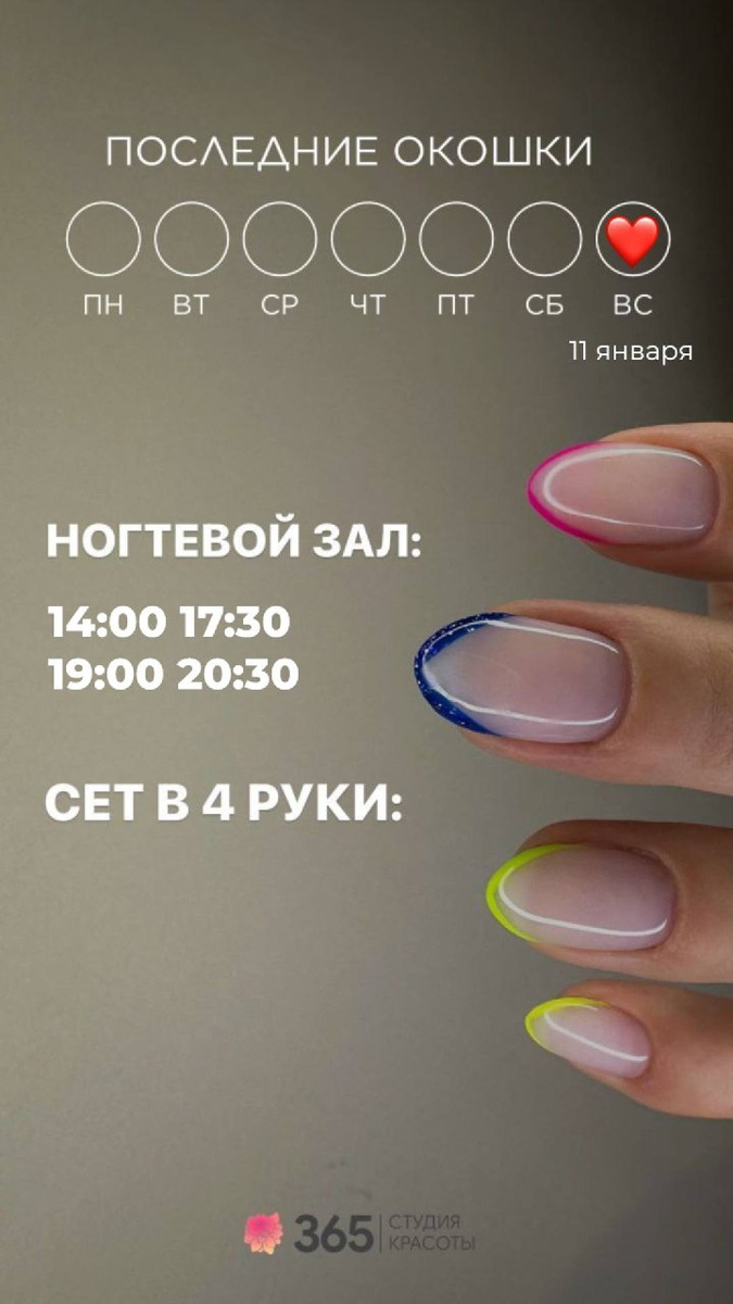 🥰 Завтра прекрасный, воскресный выходной день 😇 Самое время записаться на любимые бьюти процедуры, расслабиться и отдохнуть душой 😇😍 - сделаем все для вашего уюта и удобства 😇 #красота #наслаждение #забота #зима #любовь #мечты сбываются #радость #возможности ЧТО МОЖНО УСПЕТЬ СДЕЛАТЬ 11 января 2026 года : Ногтевой зал: 14:00 17:30 19:00 20:30 Парикмахерский зал: 12:30 16:00 18:00 Оформление бровей и ресниц: ближайшая дата для записи 13 января Косметология/шугаринг: ближайшая запись на 16 января ЗАПИСАТЬСЯ МОЖНО ЛЮБЫМ УДОБНЫМ СПОСОБОМ: 👉🏻 Сообщение в Whats'app https://wa.me/79663654477 👉🏻По телефону +79663654477 👉🏻Онлайн запись https://n286444.yclients.com/ #команда365 #красота #наслаждение #забота #зима #январь #любовь #мечтысбываются #радость #возможности
