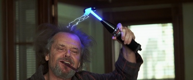 Следующий важный момент в фильме заключается тоже в фарсе: для того, чтоб из мягкотелого человека сделать адекватного, нужно обвинить его в том, что он является полной противоположностью самому себе реальному — нужно обвинить его в том и только в том, чего у него нет и не было никогда — в излишней агрессивности по отношению к окружающим, как основному источнику всех его жизненных проблем. Как такое возможно? Нужно сообщить ему о том, что он глубоко агрессивен внутри себя, и ему нужно научиться выплескивать свою агрессию наружу, но только таким образом и только тогда, когда это действительно необходимо. И убедить его в этом может только уважаемый в обществе эксперт по части психологии, каковым и является персонаж Джека Николсона, который играет так в фильме, будто он черт или даже дьявол; но с другой стороны множество ужимок и мимики мне кажутся от него излишними.