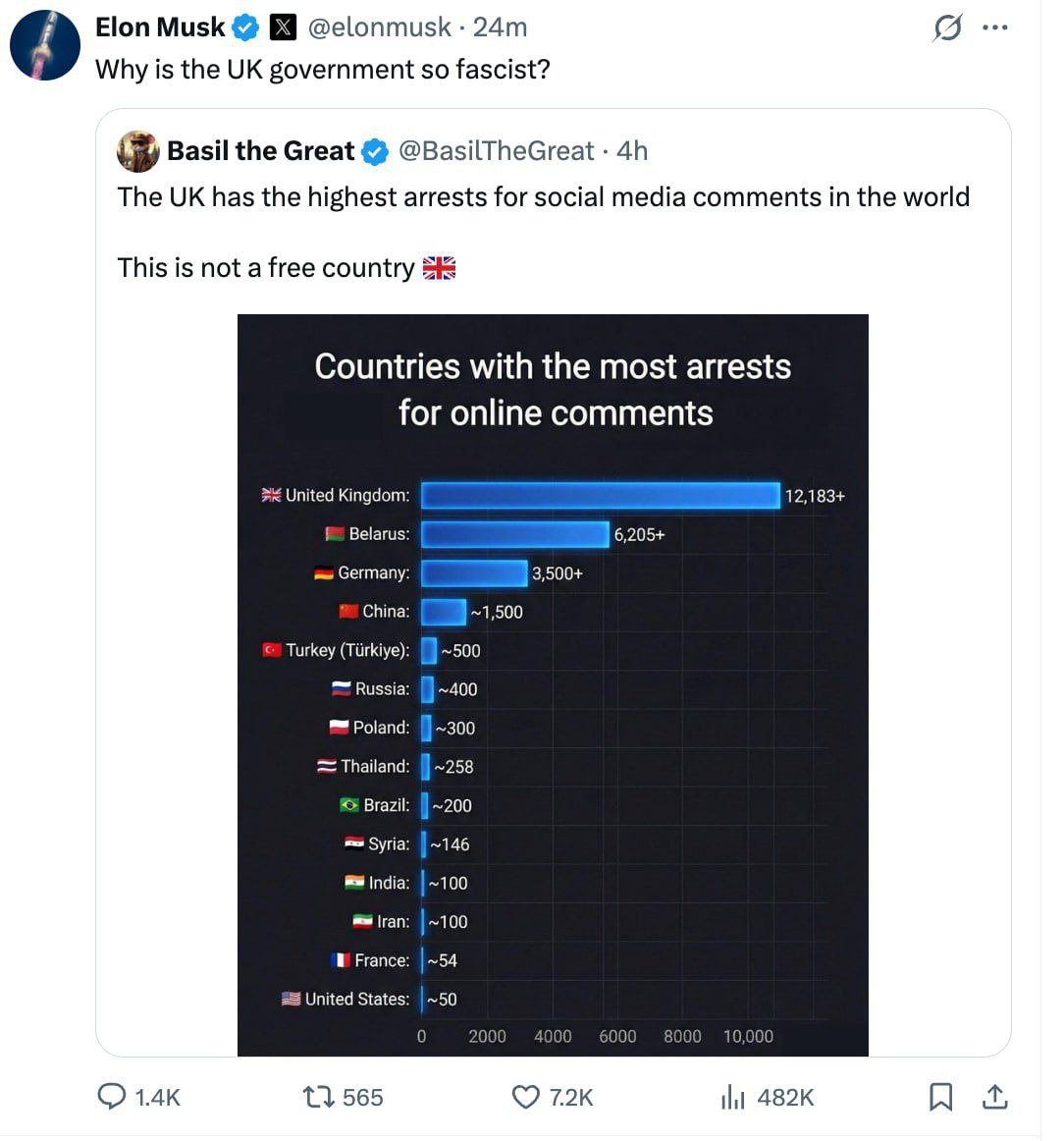». Поводом стала шокирующая статистика: за год в стране более 12 000 арестов за посты и комментарии в соцсетях. #Маск #Критика #СвободаСлова #Великобритания #Цензура 🔔 Подпишись | 👍 Поставь реакцию | ♻️ Репост