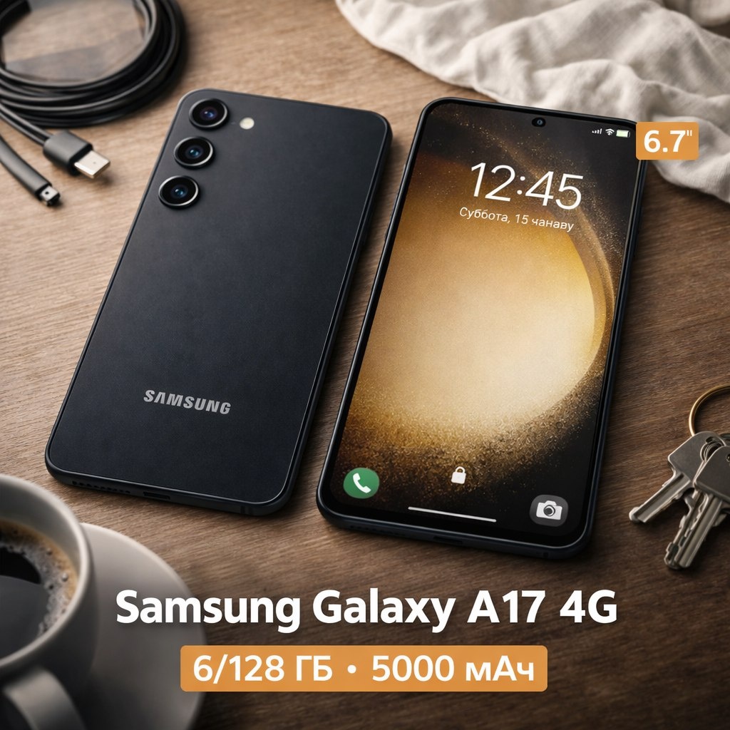 Смартфон Samsung Galaxy A17 4G 6/128 ГБ в черном цвете — это сбалансированное устройство среднего ценового сегмента с ярким Super AMOLED-экраном 90 Гц, мощным процессором MediaTek Helio G99 и емким аккумулятором 5000 мАч.