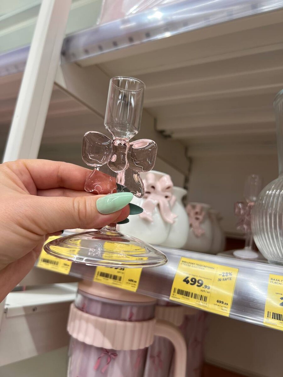 Стеклянный подсвечник за 499 рублей выглядит так хрупко, что на него страшно даже дышать. Розовый прозрачный бант посередине добавляет сто очков к атмосфере «ужина при свечах в одиночестве». 🕯️ Покупаем, зажигаем свечу и представляем, что мы в викторианской Англии, а не в хрущевке. 🏰