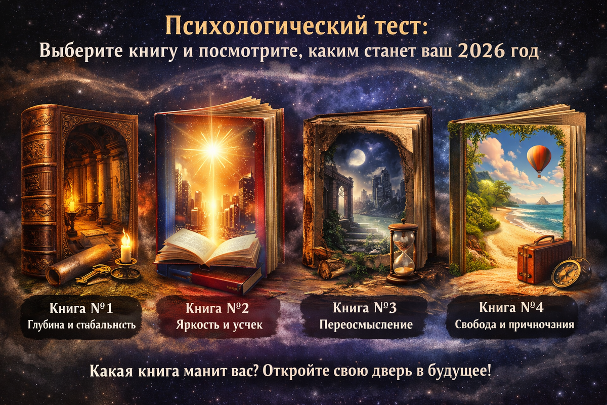 Будущее редко дает готовые ответы. Чаще оно как книга с пустыми страницами - выбирать, что написать, придется вам самим. Этот тест не предсказывает события. Он показывает, на что вы сейчас настроены и в каком ключе можете проживать следующий год. Посмотрите на четыре книги и выберите ту, которая первой привлекла ваш взгляд. ❗ Важно: не анализируйте и не сравнивайте. Выбирайте первую книгу, на которую упал взгляд, даже если не можете объяснить почему. Первый выбор честнее всего отражает ваше состояние. 🧠 Ваше состояние сейчас: