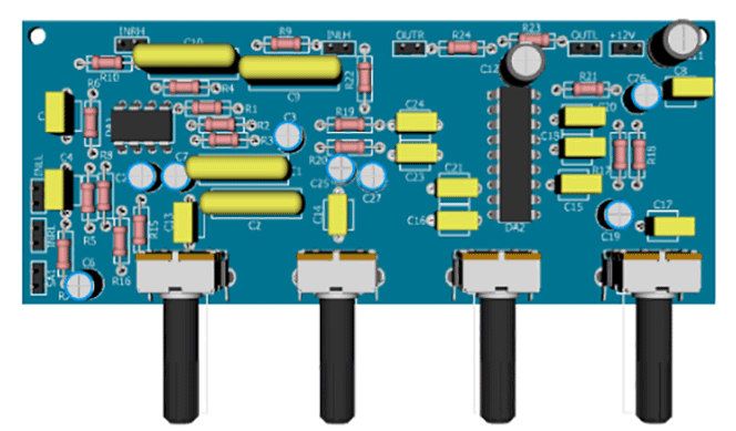 Поскольку усиления TDA1524 недостаточно для того, чтобы использовать ее для подключения устройств с малым уровнем сигнала, например, микрофона, в каждом из каналов предусмотрен дополнительный усилительный каскад на ОУ NE5532. Конденсаторы С4 и С5, включенные параллельно резисторам обратной связи, осуществляют высокочастотную коррекцию.