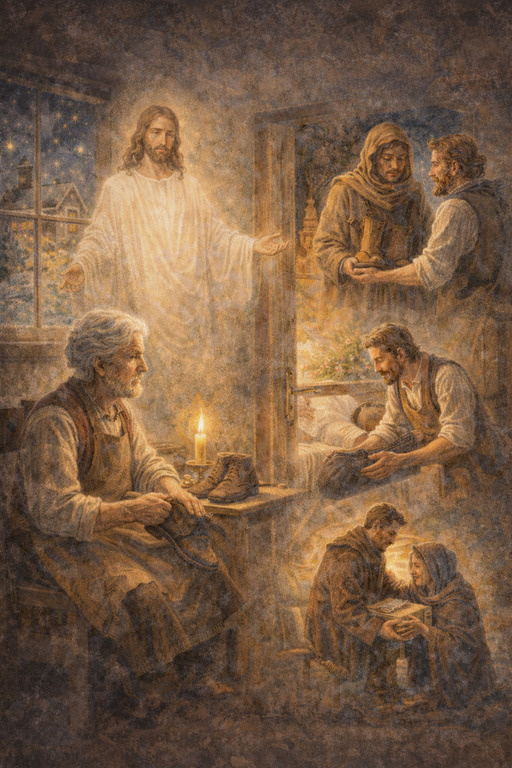 Жил в одном селении сапожник. Жил он праведно, имел веру сильную. И вот перед одним из великих церковных праздников сапожник занемог. Опечалился он, что не сможет попасть в храм, как вдруг, прямо накануне праздника, приснилось ему, как будто чей-то голос, совсем тихий и кроткий, говорит: «Раз ты не сможешь прийти ко Мне, Я приду к тебе в этот день». Проснулся сапожник и обрадовался: «Неужто Сам Господь ко мне пожалует?» – думал он. Всё утро он наводил порядок и чистоту у себя дома, готовил праздничные угощения и как мог, так и готовился к приходу желанного Гостя. И вот, во время подготовки он увидел за окном рыдающего мальчика. Подозвав его к себе, сапожник спросил: – Почему ты плачешь? – У меня сегодня порвались ботинки, и мне не в чем ходить. А живём мы в семье бедно, новые купить не сможем… Тогда сапожник успокоил мальчика: – Давай мне ботинки, я починю тебе их. Через некоторое время мальчик, весь сияющий от счастья, стоял в починенных ботинках. Проводив его, сапожник продолжил пр