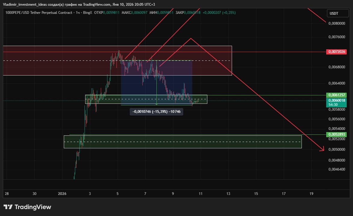 #PEPE разбирали ранее, после цена провалилась на 15% от обзора, пришли к поддержке. Но и ее пробьют)