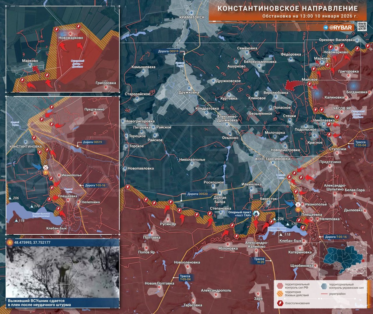 Карта боевых действий группировки войск "Юг" в районе Константиновка на 10.01.2026.