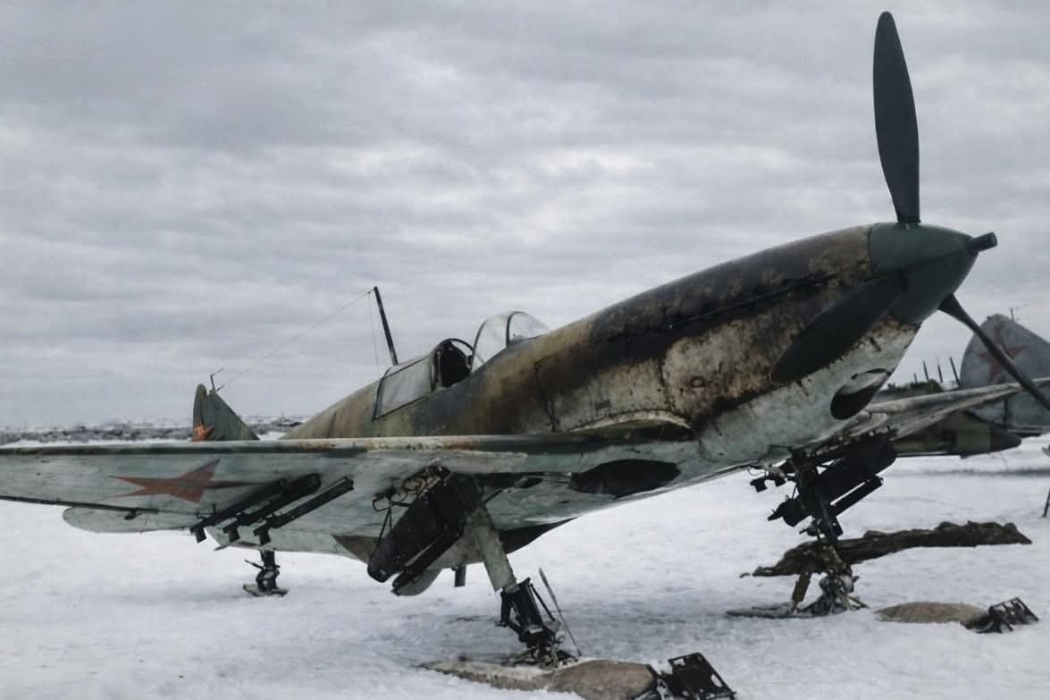 ЛаГГ-3, переживший войну, на лыжах и с ракетными направляющими, установленными под крылом. Год фото и местонахождение неизвестны.