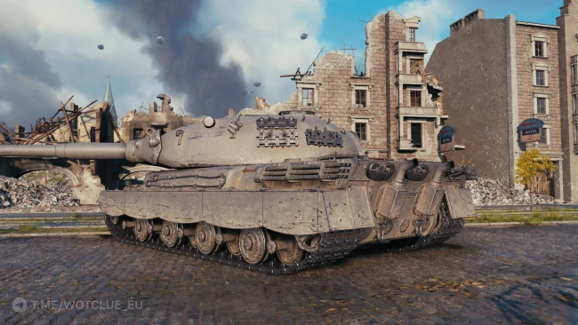 Помните Е100 с закисью азота, он же Feuerbar? Так вот, незадолго до него на евро сервере появился непрямой аналог - Schwertwal, он же Косатка, он же немецкий 60ТР на ускорителях. Однако, если танк на Лесте довольно быстро стал доступен (ведь он создавался конкретно под новый запуск Натиска), то ВГшный был доступен только на китайском регионе в лутбоксах. Как и многие нынешние танки на Евро сервере, Швертвал выдуман. Больше всего он напоминает раздутый Леопард, но с двумя рубками спереди и подвеской Е-серии. А курсовой пулемет расположен так, что он будет бить стрелку-радисту по ноге. Но надо отметить: двигатель и орудие существовали. 15см корабельное орудие, вообще не похожее на оригинал. 700/900 урона, 259/325/85мм (ББ/КС/ОФ) пробития. ДПМ 2600, для такой альфы немало. Сведение, разброс и стабилизация абсолютно идентичны 60ТР: Однако есть нюанс: корабельная скорость полета снаряда 800/700 м/с. УВН тоже идентичны 60ТР: -8 градусов, правда это важнее для следующего пункта. Традиционн