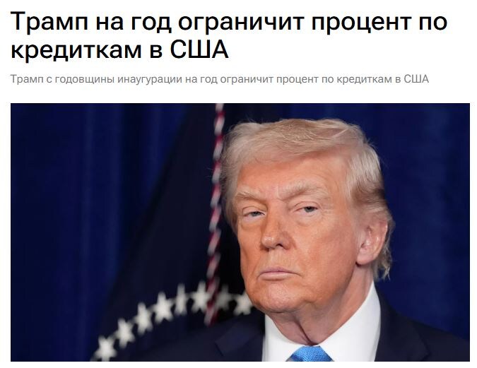Президент США Дональд Трамп объявил о введении на год фиксированного максимума процентной ставки в 10% по кредитным картам, начиная с годовщины его вступления в должность 20 января. «С 20 января 2026 года я, как президент Соединённых Штатов, объявляю о введении на год предельного уровня процентных ставок по кредитным картам в размере 10%. По совпадению, дата 20 января также станет годовщиной исторической и очень успешной администрации Трампа», - написал президент в соцсети Truth Social. Американский лидер заявил, что его администрация не позволит компаниям, выпускающим кредитные карты и взимающим процентные ставки в размере от 20% до 30% и выше, «обирать» американский народ. А что у нас? Для примера, в России процентные ставки по кредитным картам могут достигать 60% годовых по безналичным операциям. А если заёмщик снимает с карты наличные— до 80%. В неправильных руках кредитка — оружие массового опустошения кошелька. Но в правильных — инструмент заработка! Предпочитаю сам зарабатывать