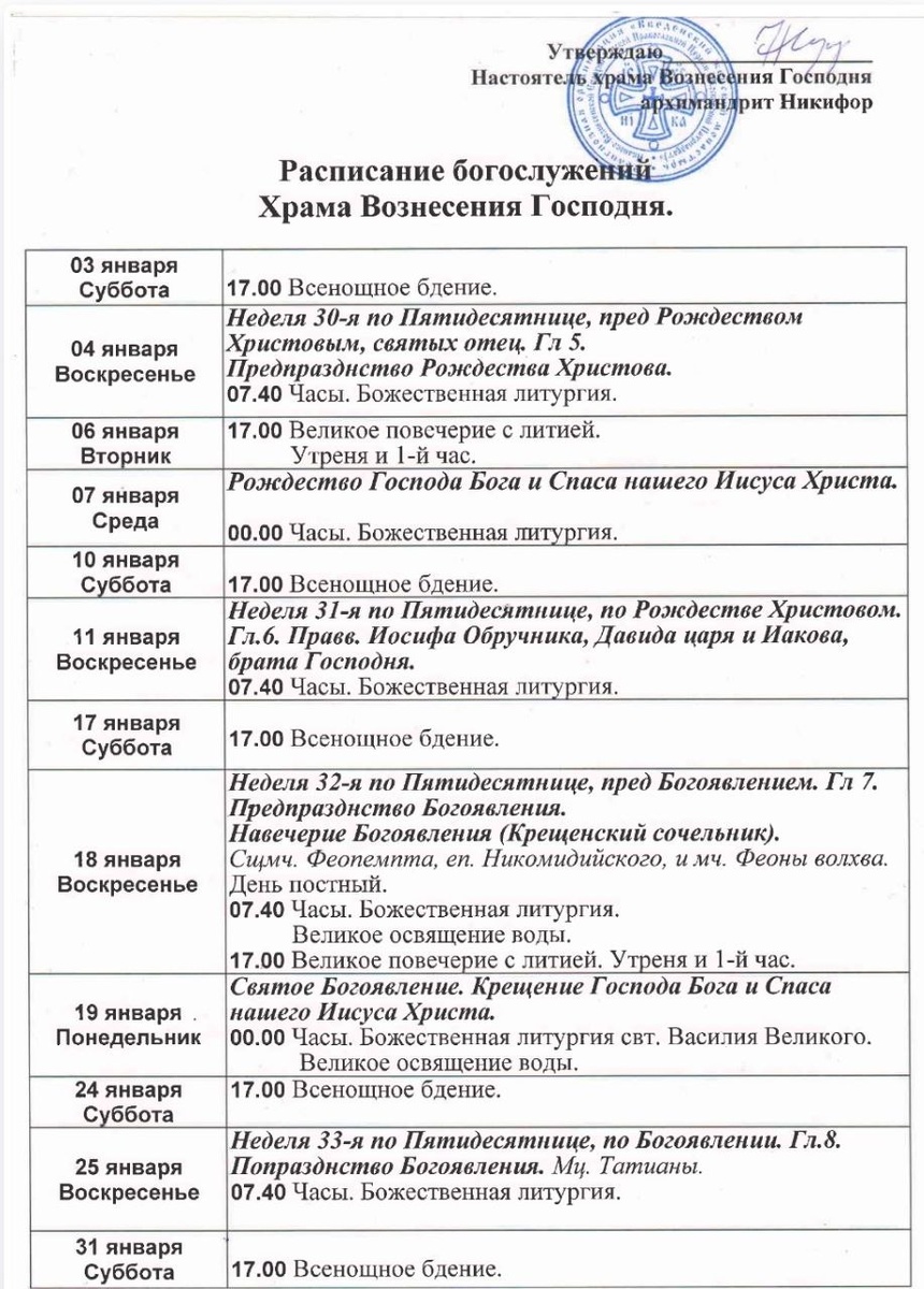 03-31.01. Расписание богослужений в храме Вознесения Господня г. Иваново