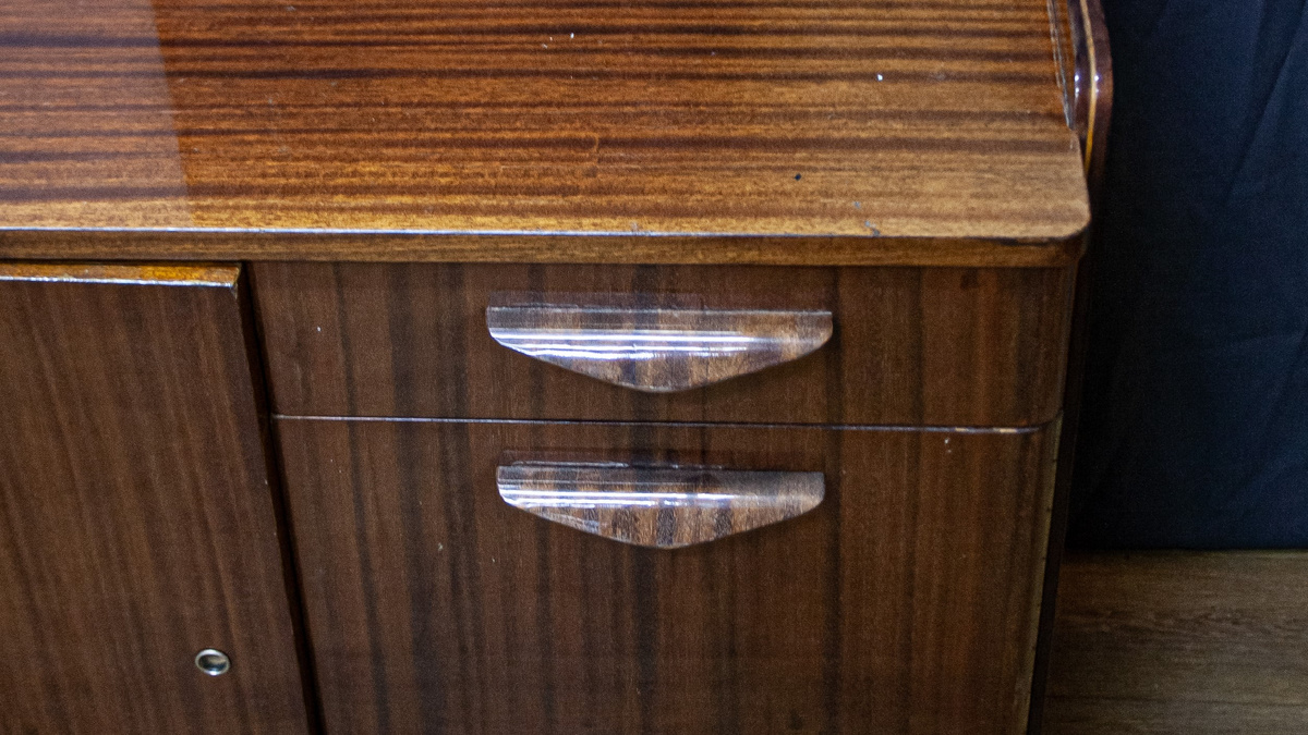 Корпусная часть была сделана из столярных плит с отделкой шпоном ореха и полировкой (толстый глянцевый полиэфирный лак, который потом возненавидят наши с вами современники). Стулья, стол и кресла — из массива бука.