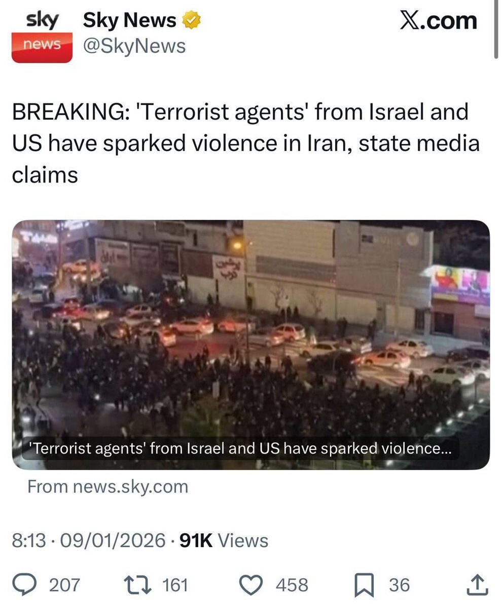 Sky News со ссылкой на «правительственные источники» утруждает, что «террористические агенты» США и Израиля подстрекают иранцев к насилию