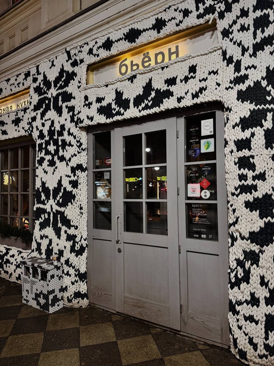 Это заведение является первым в России zero waste проектом, где объединены три кита: авторская северная кухня, бережное отношение к природе и философия осознанного счастья. Здесь каждый элемент — от интерьера до подачи блюда — часть большой истории. Ресторан имеет Michelin Green Star 2022 и собственную экологическую программу, цель которой — нулевой след и безотходное производство. Новогодний декор здесь — это искусство. Вас встречает входная группа, укутанная в «теплый снежный плед», а под потолком парит большая ель. На столах — композиции из веточек и шишек, а у гардероба вас ждет необычная елка из рогов. Общий стиль — скандинавский минимализм: кирпичные стены, деревянная мебель, силуэты животных. Посадка довольно плотная, но у оконных столиков чувствуется простор. На подоконниках — тематические инсталляции, которые меняются в зависимости от сезона. Персонал работает как единый отлаженный механизм: вежливо, быстро и с душой. При подаче официант подробно рассказывает о блюде, а иногда