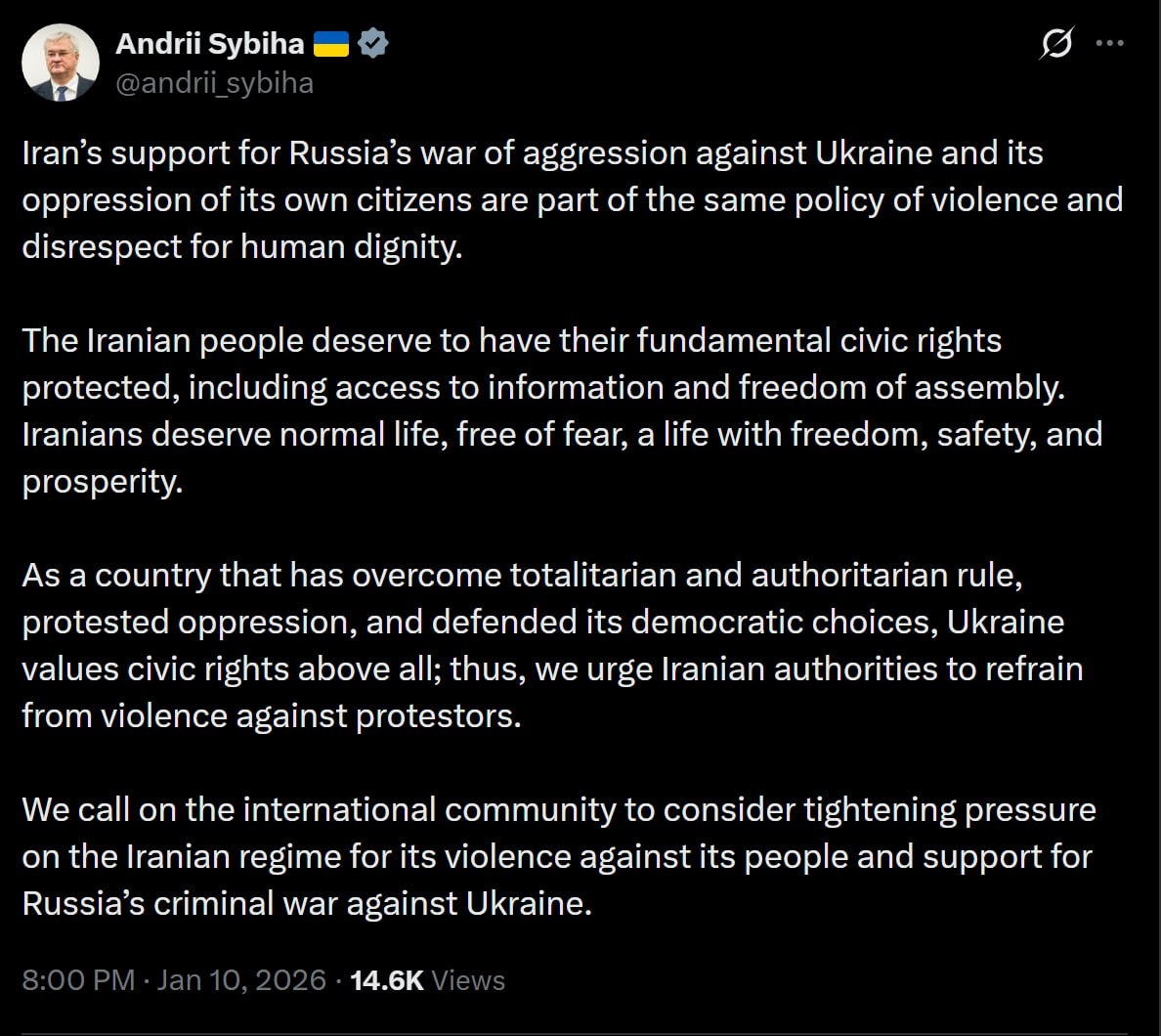 : Поддержка Ираном агрессивной войны России против Украины и угнетение собственных граждан являются частью единой политики насилия и неуважения к человеческому достоинству. Иранский народ заслуживает защиты своих основных гражданских прав, включая доступ к информации и свободу собраний. Иранцы заслуживают нормальной жизни без страха — жизни в условиях свободы, безопасности и процветания. Как страна, преодолевшая тоталитарное и авторитарное правление, протестовавшая против угнетения и отстоявшая свой демократический выбор, Украина ценит гражданские права превыше всего. Поэтому мы настоятельно призываем иранские власти воздержаться от насилия в отношении протестующих. Мы призываем международное сообщество рассмотреть возможность усиления давления на иранский режим за его насилие против собственного народа и поддержку преступной войны России против Украины. 🟪Читай в Max | 🚀Читай в Telegram | 🥰Смотри на RUTUBE