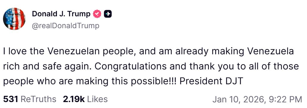 Я люблю венесуэльский народ и уже делаю Венесуэлу снова богатой и безопасной. Поздравляю и благодарю всех, кто делает это возможным!!!
