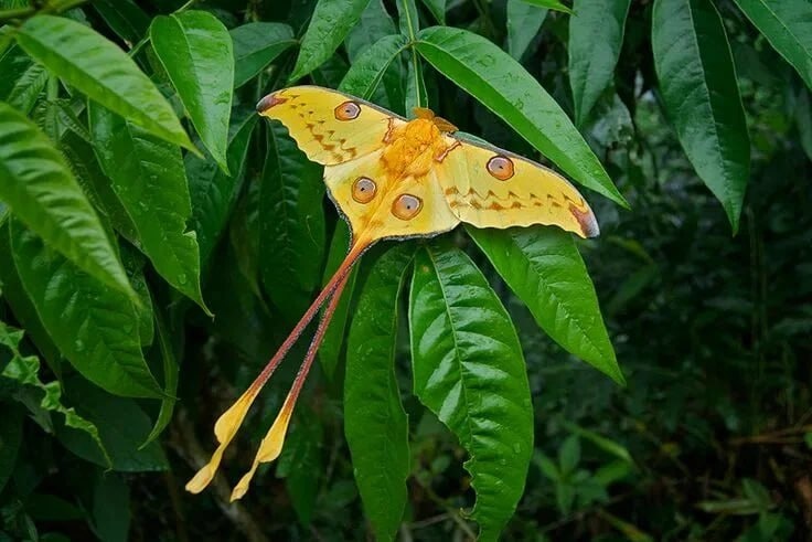 Крупная бабочка из семейства павлиноглазок. Обитает во влажных тропических лесах Мадагаскара. Размах крыльев 14–18 см. Крылья окрашены в янтарно-жёлтый цвет. Самцы лунной моли оснащены длинными хвостами на нижних крыльях, которые отражают ультразвуковые сигналы летучих мышей. Это помогает самцам не быть съеденными. Гусеницы лунной моли, если приближается птица или другой хищник, часто встают на дыбы и пытаются отпугнуть нападающего. У лунной моли нет рта, так как она занята размножением и не может есть. За время существования в форме гусеницы лунная моль накапливает достаточно калорий, чтобы превратиться в крылатое создание, полетать на воле и спарится в течение всего 7–10 дней. 📱 Телеграм: https://dzen.ru/id/651983a11cf2387b25169947